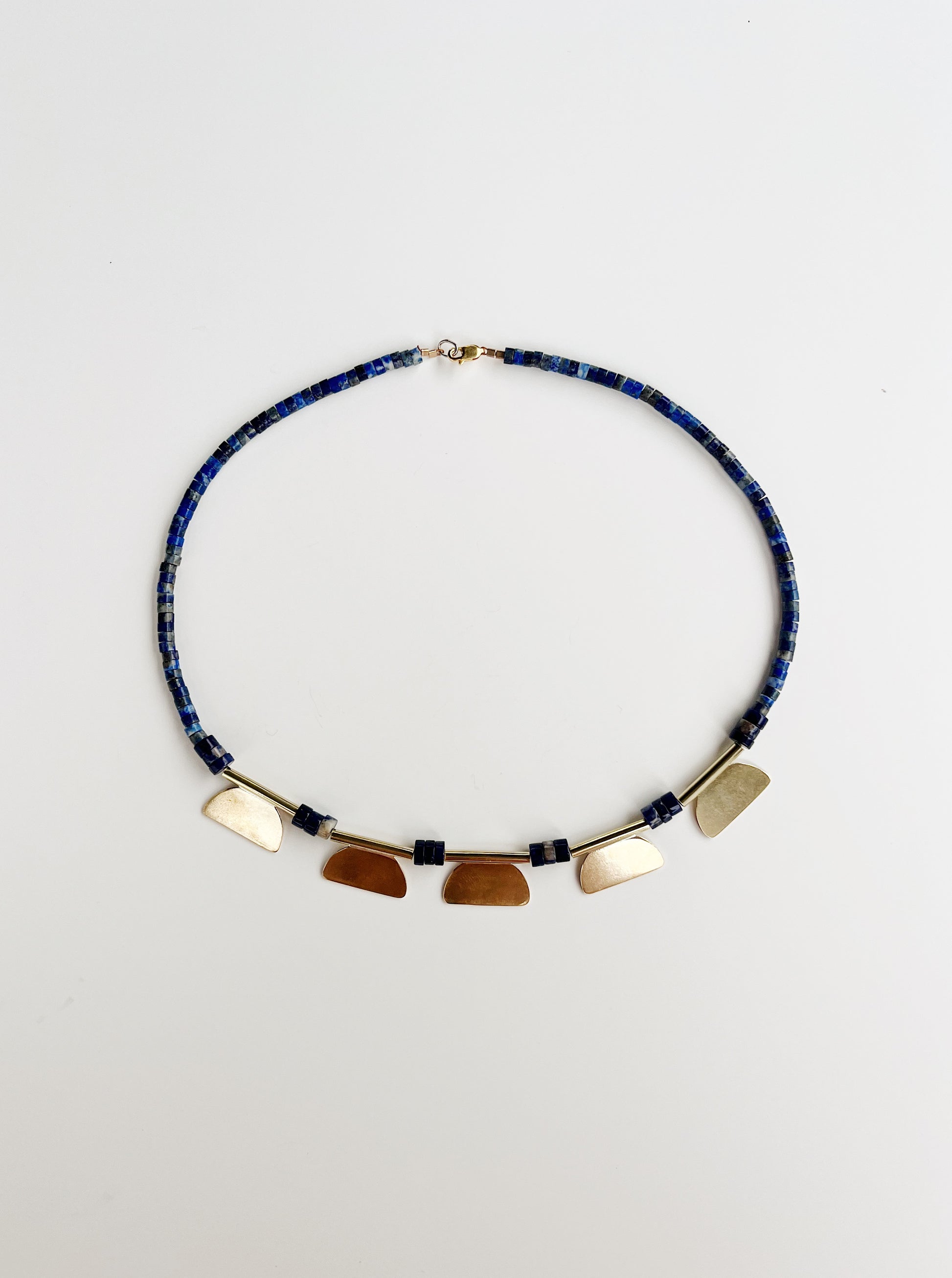 Hand fabricated brass pendants paired with 5mm dark lapis beads and 4mm lapis heishi beads.14k gold fill clasp. This necklace is 19'' long and one of kind. Hangs right at or just below collar bone depending on your personal structure.