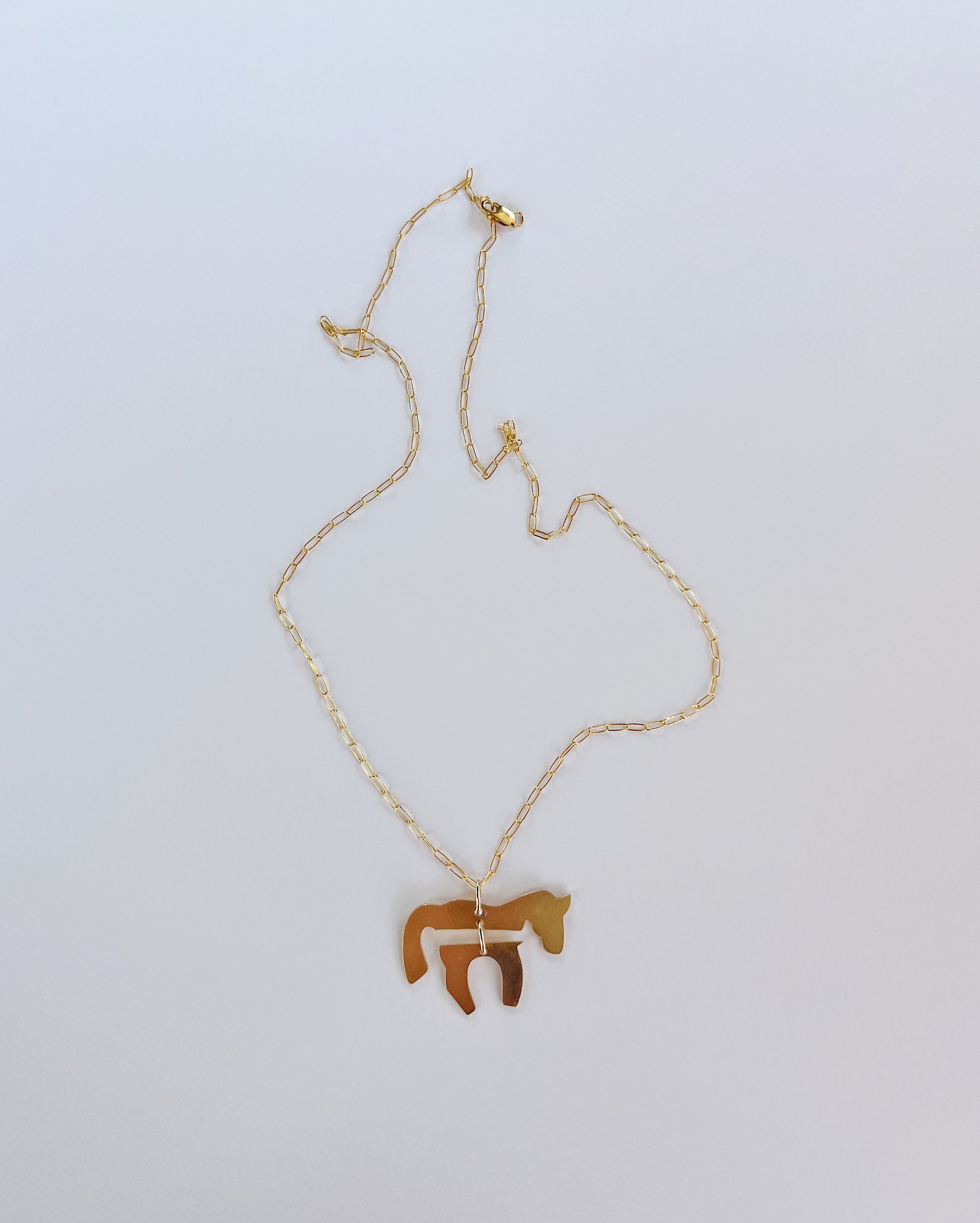 Limited ed. Moving On necklace has a sweet horse as the pendant with moving parts. The pendant is 1 1/4'' wide by 1'' long. Available in: